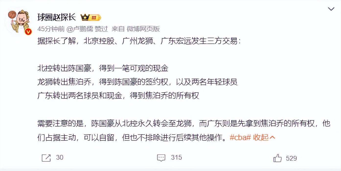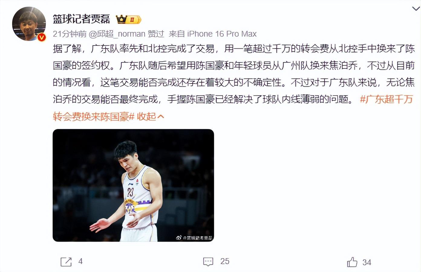 紧接着反转又来了,篮球记者贾磊爆料:广东与北控率先完成交易,用千万转会费从北控手中换来陈国豪的签约。