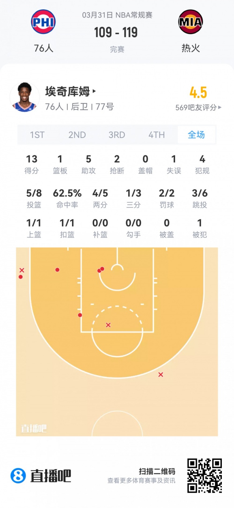 76人探花秀埃奇库姆 登场29.9分钟
