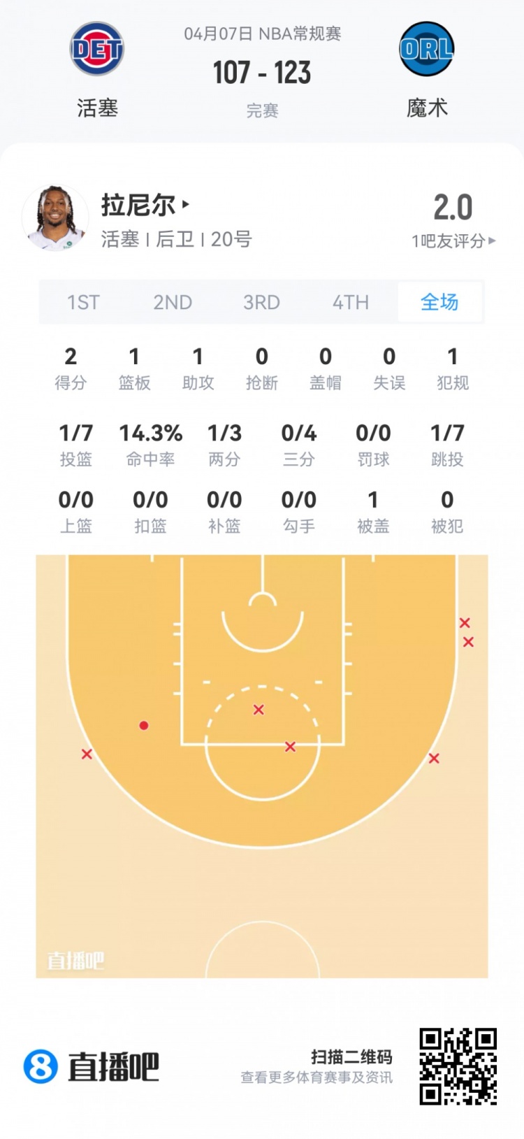 活塞次轮查兹·拉尼尔 登场16分钟